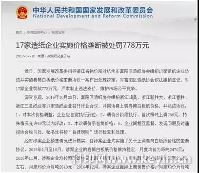 纸价的上涨不仅引来了央视的重视,近日,国家发展改革委也终于出手了,对纸价上涨的企业重拳出击!7月10日,中华人民共和国国家发展和改革委员会官网发布了一条新闻:17家造纸企业实施价格垄断被处罚778万元。